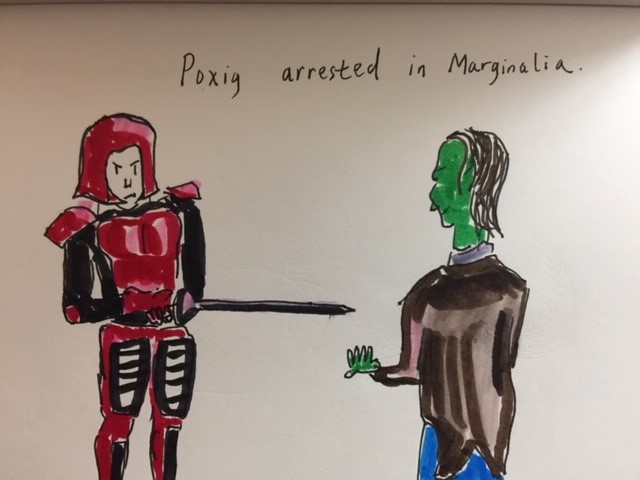 As he opened the door, he saw a detachment of soldiers sneak up beside him. They pointed their halberds toward him. “Halt where you are you elvish scum!” said one of the guards. Poxig knew that he could not resist such military force.