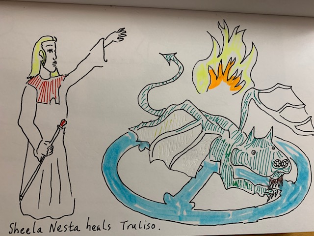 Sheila Nesta almost could not believe her ears. She knew of dragons, but she had never actually seen one. As the party of three ventured outside of the city walls, they could hear the cries of the dragon whelp in the clearing, who was moaning and growling in pain. They came upon Truliso, and the situation was more dire than expected. The dragon could hardly move, the wounds of the human arrow attack still fresh and bleeding profusely.