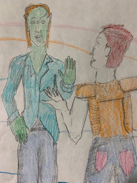 Thanks to Emma Gonzalez for the crayon coloring for this drawing of Poxig and Tefl.